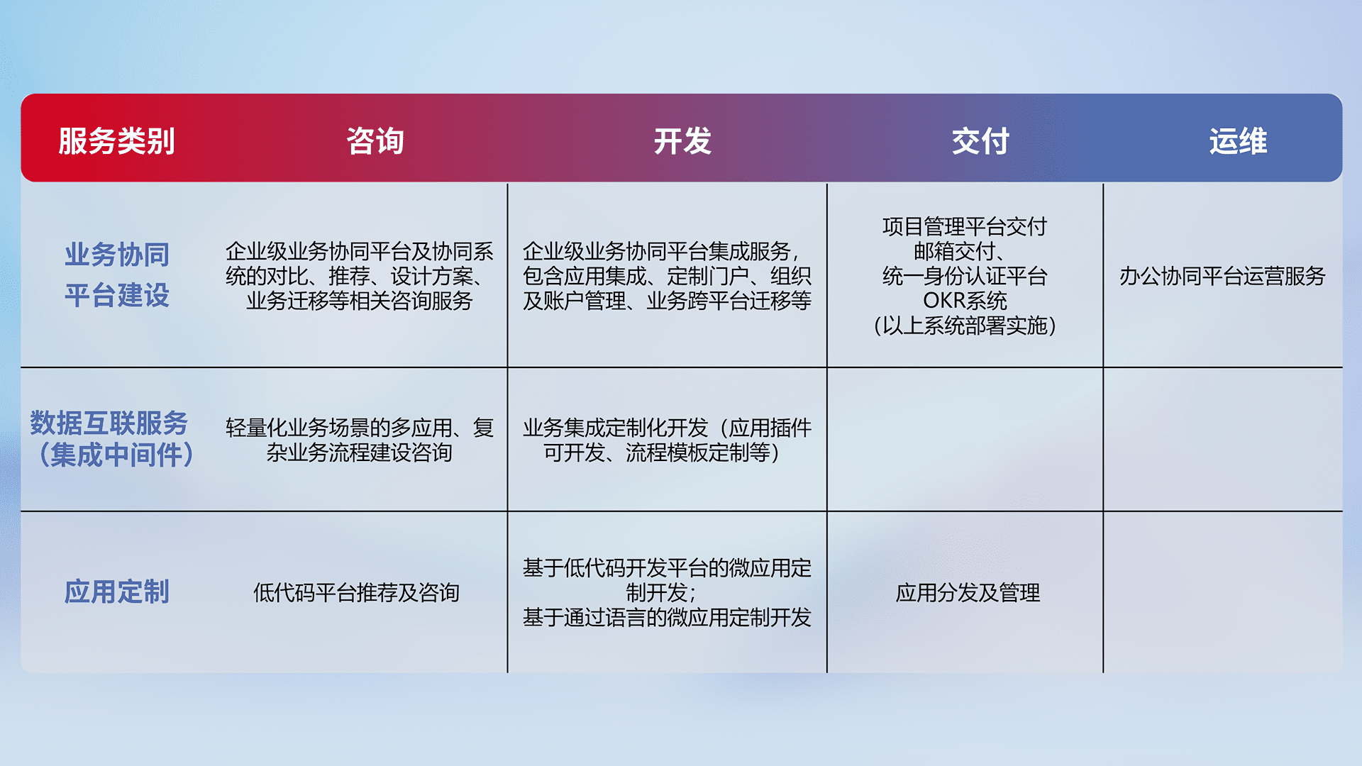 针对钉钉、、、企微、、、IDaas等平台级产品提供产品的规划、、、方案、、交付、、、、定制化开发等服务,,,实现如统一协同办公、、、智能客户服务、、混合会议管理、、、智能数据查询、、等业务场景,,,,实现数字化转型。。。。